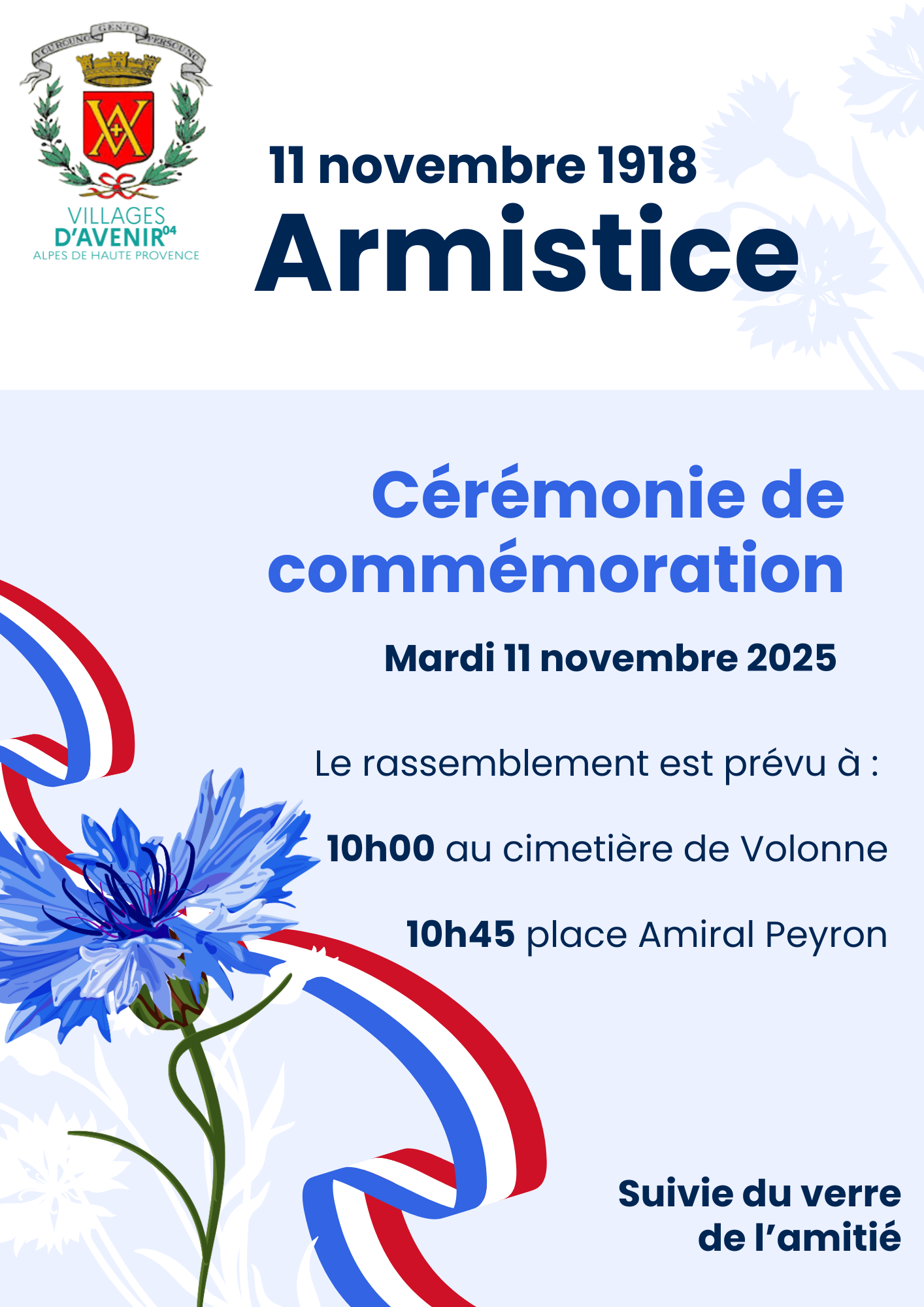 Madame Sandrine COSSERAT, Maire de Volonne, et le Conseil Municipal ont l’honneur de vous inviter à la cérémonie commémorative de la Victoire et de la Paix, en hommage à tous les “morts pour la France”,[...]