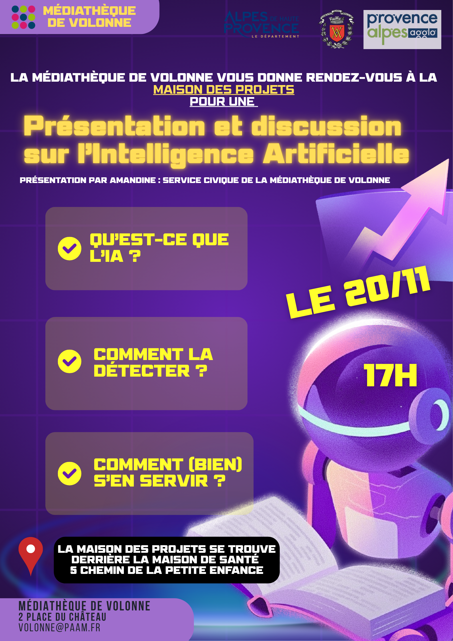 📢 La Médiathèque de Volonne vous invite à un rendez-vous passionnant ! Présentation et discussion sur l’Intelligence Artificielle 📍 Lieu : Maison des Projets (derrière la Maison de Santé, 5 chemin de la Petite Enfance)[...]