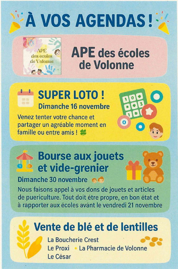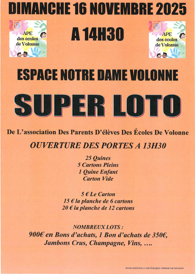 🎉 SUPER LOTO à Volonne ! 🎉 Organisé par l’Association des Parents d’Élèves des écoles de Volonne 📅 Dimanche 16 novembre 2025 📍 Espace Notre Dame – Volonne 🕑 Début à 14h30 (ouverture des portes[...]