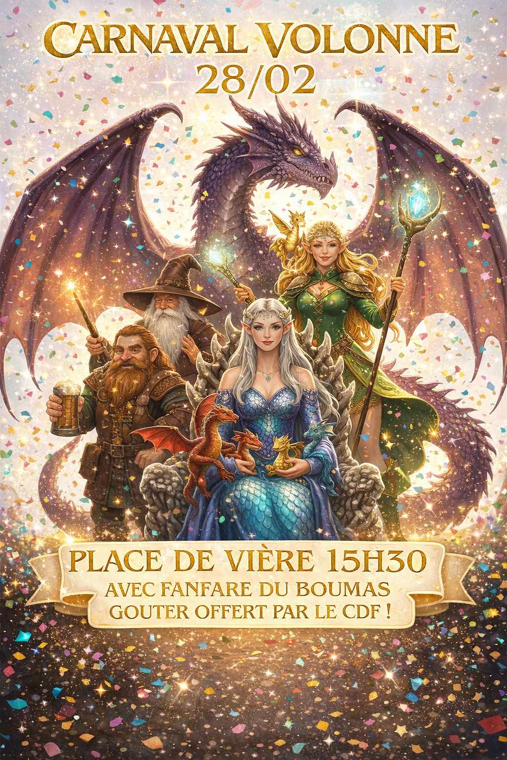 Le 28 février 2026, le Comité des Fêtes organise un carnaval Il aura lieu place de Vière dès 15h30 Goûter offert par le Comité des Fêtes!