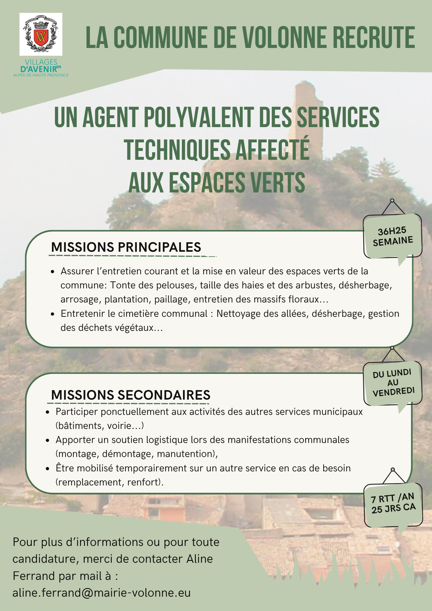 La commune est à la recherche d’un agent des services techniques, principalement affecté à l’entretien et à l’aménagement des espaces verts.
