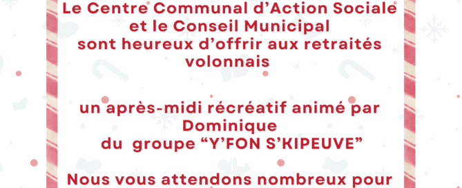 Le Centre Communal d’Action Sociale et le Conseil Municipal ont le plaisir d’inviter tous les retraités volonnais à partager un moment chaleureux et convivial. 📅 Date : Jeudi 11 décembre 2025 🕒 Heure : 15h00 📍 Lieu : Espace Notre Dame Au programme : ✨ Un après-midi récréatif animé par Dominique du groupe “Y’FON S’KIPEUVE” [...]