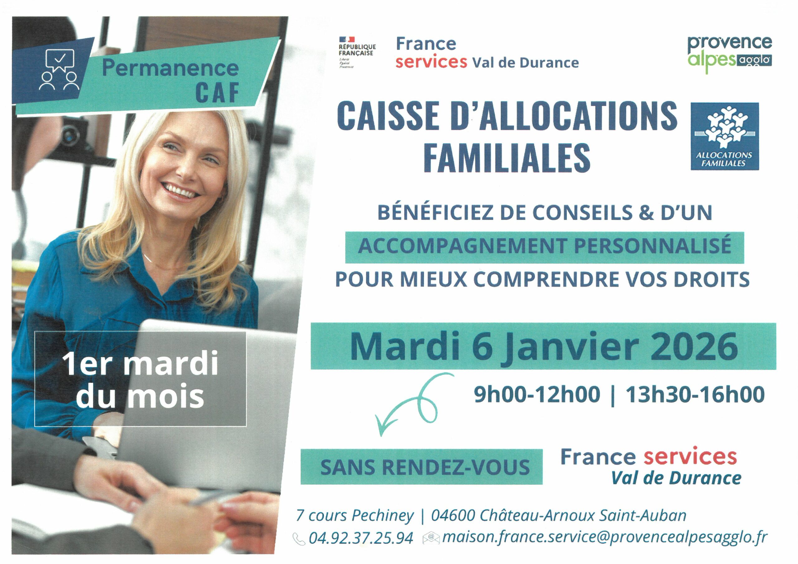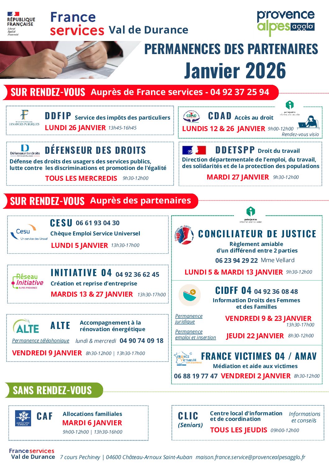 Voici les différentes permanences qui auront lieu en janvier 2026 dans les locaux de France Service 7 cours Péchiney à Saint Auban