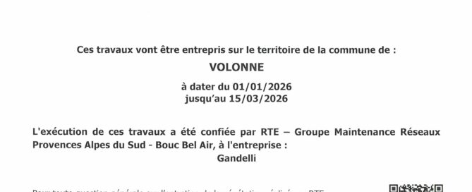 Des travaux d'élagage doivent être faits afin de maintenir les lignes à haute tension en bon état de fonctionnement. Ils seront entrepris sur le territoire de Volonne du 01/01/2026 au 15/03/2026. Pour toute information : https://www.rte-france.com/riverains/modalites-de-gestion-de-la-vegetation-sous-et-aux-abords-des-lignes-electriques